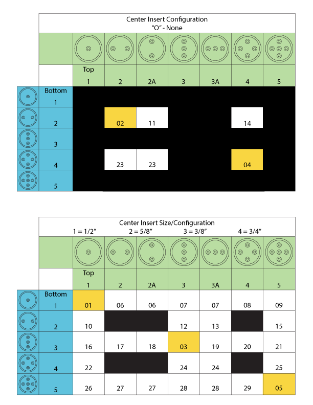 The graphic below illustrates how we define the insert pattern in our part numbers. For a complete breakdown of part number details, see our support insulator part number cheat sheet.