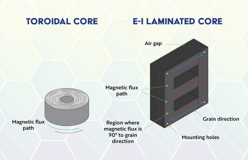 Toroidal power transformers have a lower core loss, operate at a higher flux density, and allow the conductive windings to be in intimate contact with the core. This enhances current flow at all points in the core yielding a transformer, which is smaller than its E-I transformer counterpart.